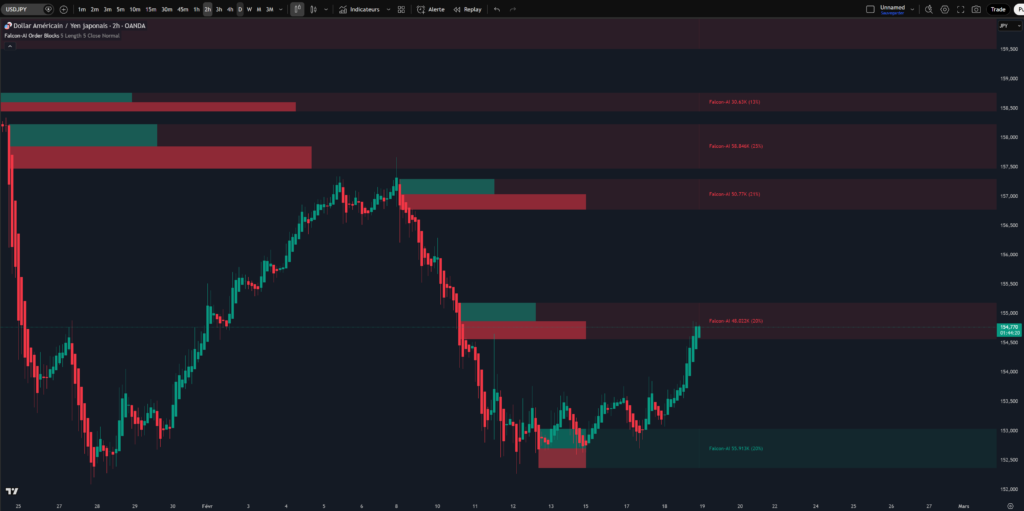 يساعد المؤشر أيضًا على التعرف على مناطق الانعكاس المحتملة، مما يمنح المتداول رؤية أوضح حول حركة السعر ويزيد من قدرته على اتخاذ قرارات تداول أكثر دقة واحترافية. من خلال دمج Falcon AI Order Block مع Falcon AI وFalcon AI Zone Power، يحصل المتداول على نظام تحليل متكامل يوفر إشارات مؤكدة وفهمًا أعمق لقوة السوق واتجاهه.
